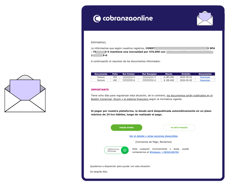 Nos comunicamos de forma respetuosa y clara, entregando facilidades de pago e informando las consecuencias en caso de no saldar el monto adeudado.