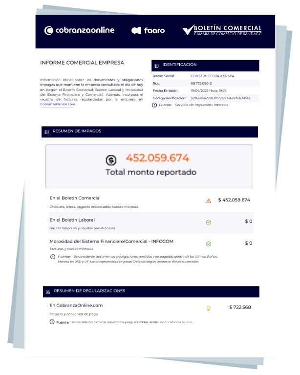 Acreditar la situación comercial de tu empresa frente a evaluadores: deudas y antecedentes comerciales con código de verificación incluido.